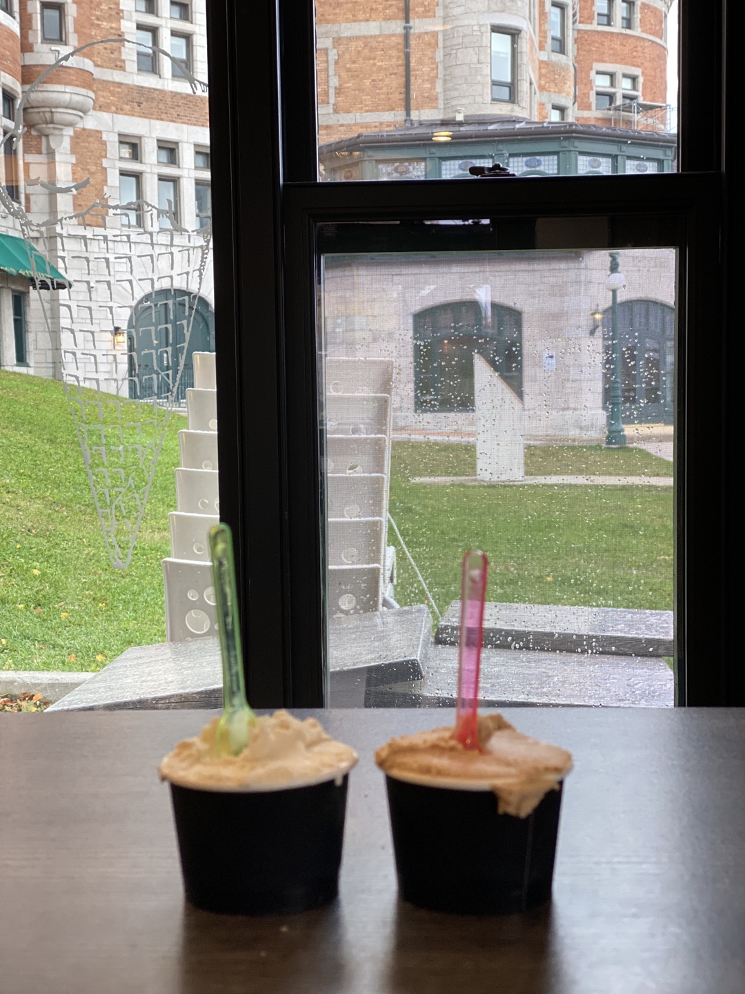 * 1884: 페어몬트 호텔에서 무료 아이스크림 쿠폰을 2장 주었다. 테라스에 있는 작은 카페인데, 바람이 쌩쌩불고 비가 올거 같은날 창문가까이에 앉아 아이스크림을 먹으니 너무 좋았다. 커피나 다른 음료로 바꿀수 있다고 했는데, 아이스크림을 먹고 싶었다. 헤이즐넛 맛과 메이플 맛을 골랐다. 둘다 엄청 맛있었다. 메이플 맛은 중간중간에 메이플 설탕 같은게 들어있는데 씹는 맛이 좋다. 단걸 별로 안좋아하는 사람들에게는 비추 이지만, 나는 맛잇게 다 먹었다.